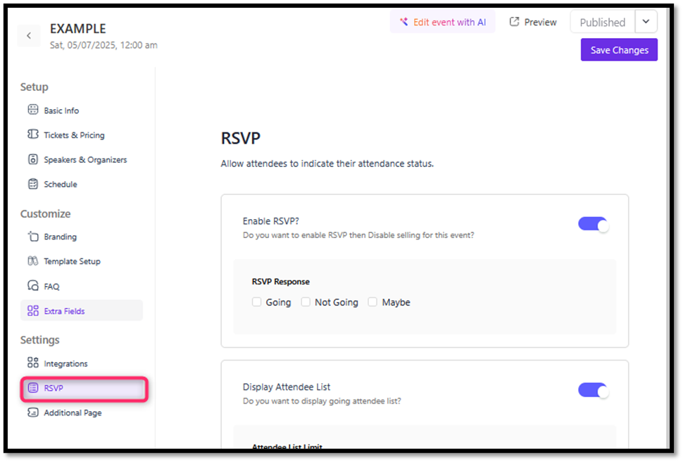 Go to the event platform. On the left menu, click Settings > RSVP.
